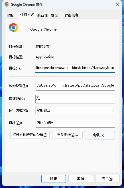 3.在目标后方添加 -kiosk https://fans.azyb.cn 注:-前面有一个空格,k后面也有一个空格,根据自己需要将网址修改成自己需要的。