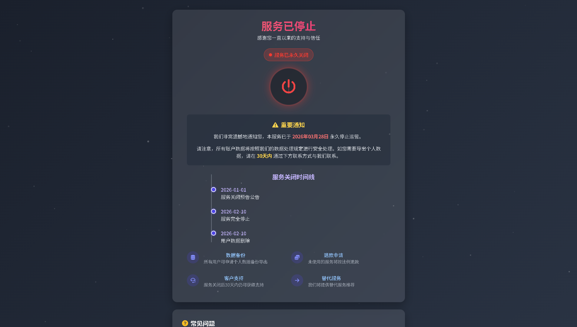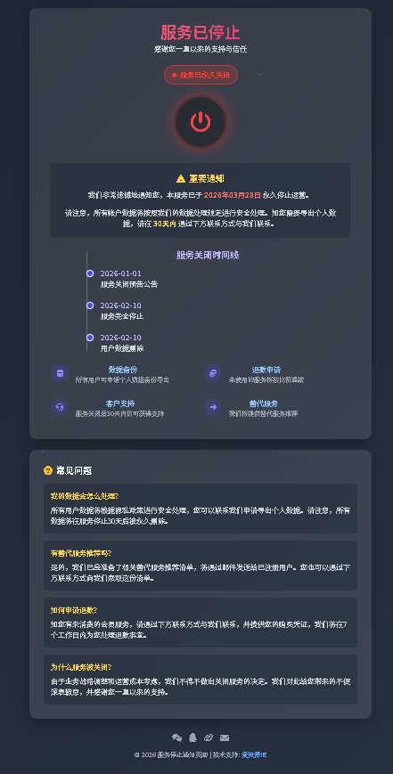 一款极简风HTML 单页网站停运公告源码,界面简洁高级、视觉舒适,完美适配电脑端 + 手机端,全自适应布局。 纯前端静态编写,无复杂后台,首页内容直接在 index.html 文件中修改即可快速自定义,新手也能一键使用,部署便捷、轻量化无负担。